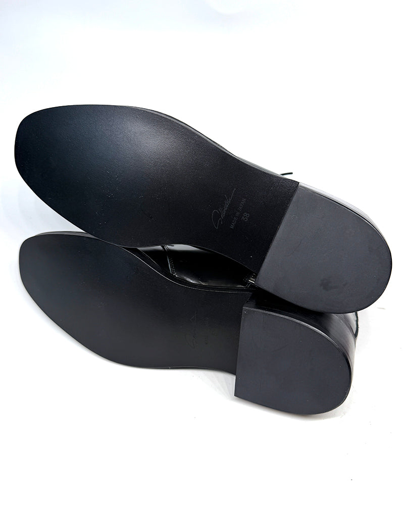 ※ 踵に小さな穴が見られる場合がございますが、靴づくりの過程で足入れにばらつきが出ないように、職人がアッパーを木型に固定する際につくものです。こちらの穴は不良ではございませんので予めご理解くださいませ。